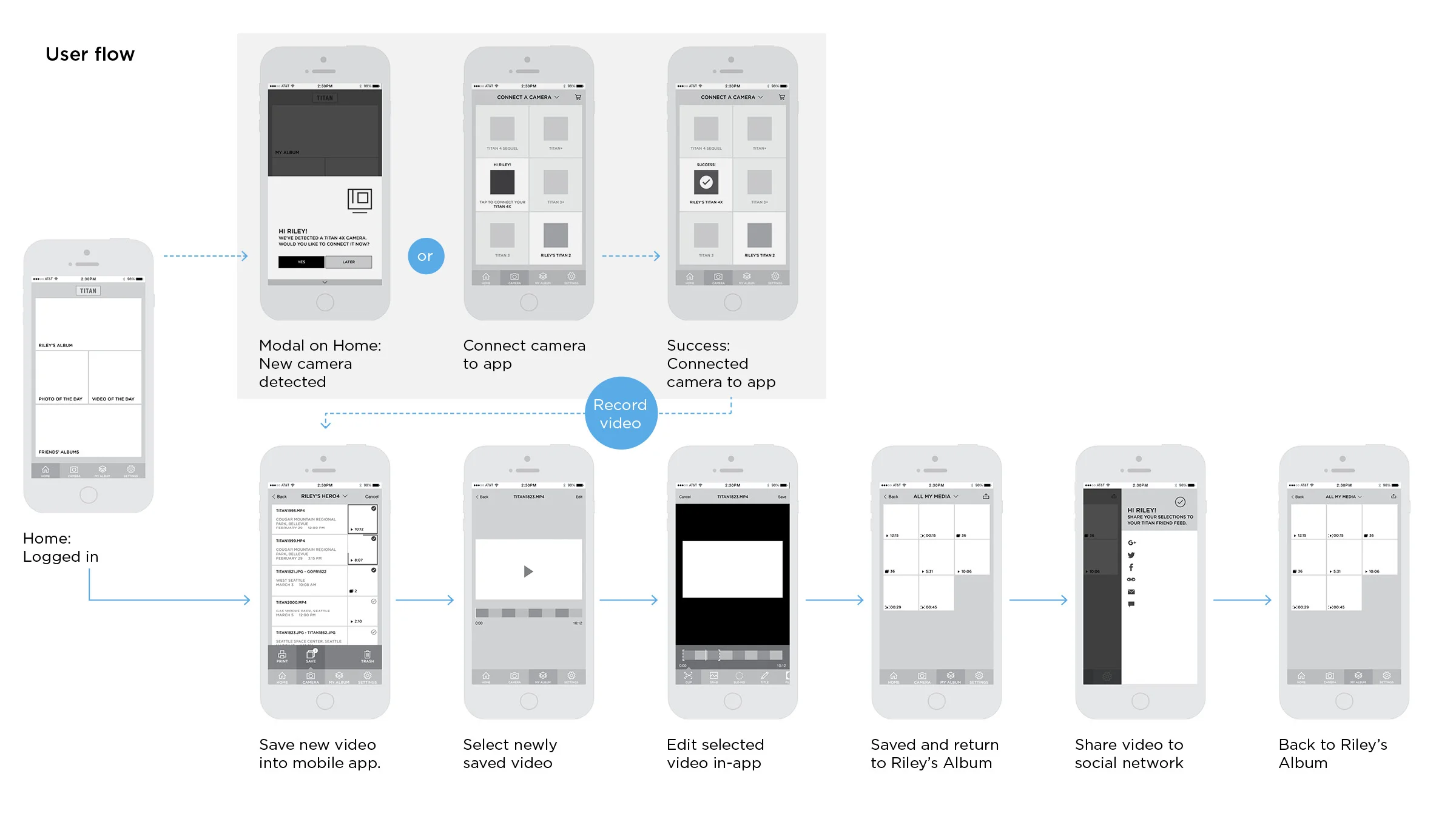 Riley just bought a brand new Titan 4X camera. He loved his older Titan 2 camera, but knew the new Titan 4X would help him capture all the fun adventures he would have with his friends. His friends have also been asking him to share all the great footage he had captured. In this scenario, the flow is:
