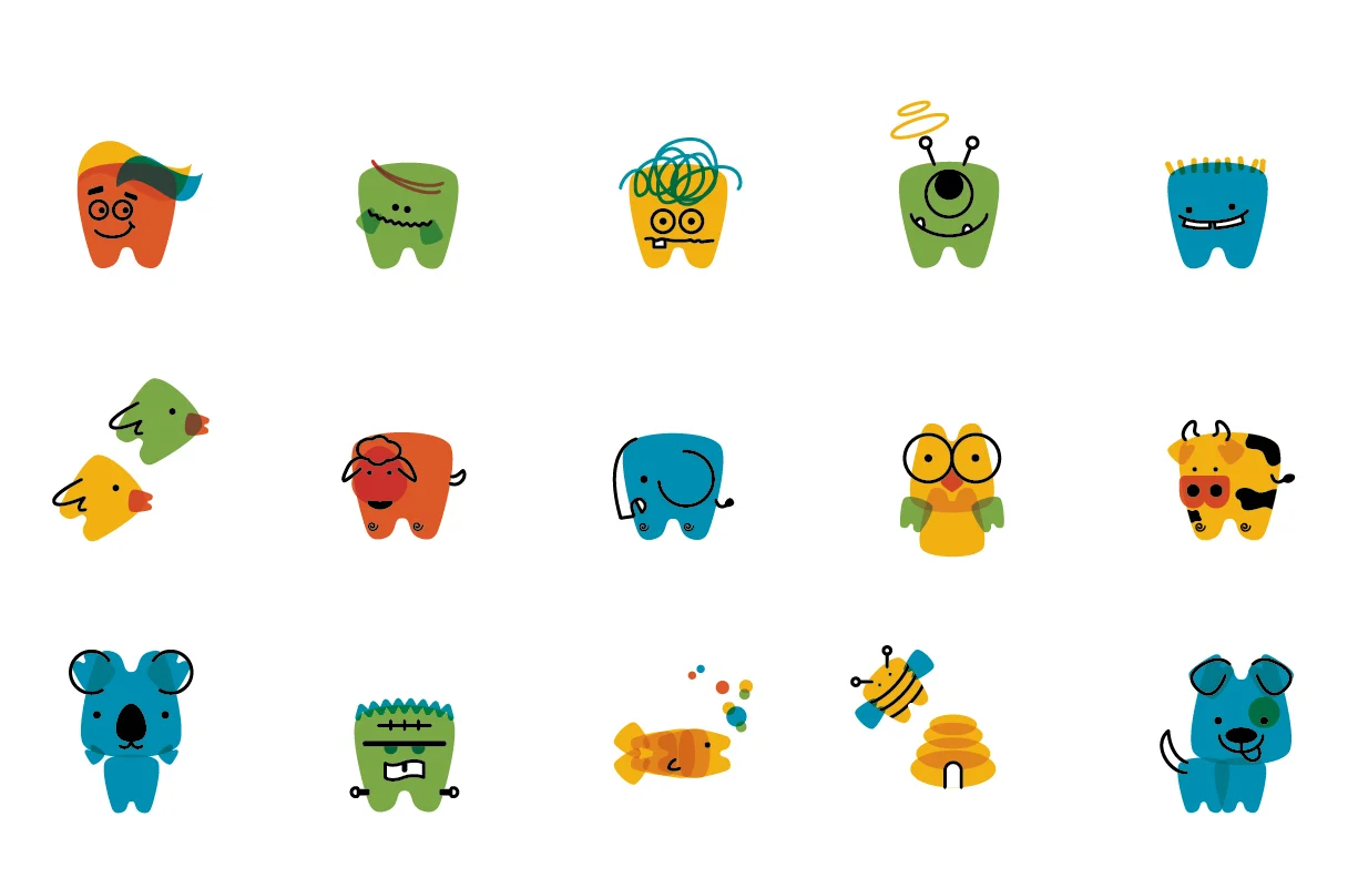 As the foundation of the brand identity system, I created 50+ icons and graphics. In addition to the tooth shape, I introduced "dental floss" line work in black, and simple shapes like toothpaste hair.