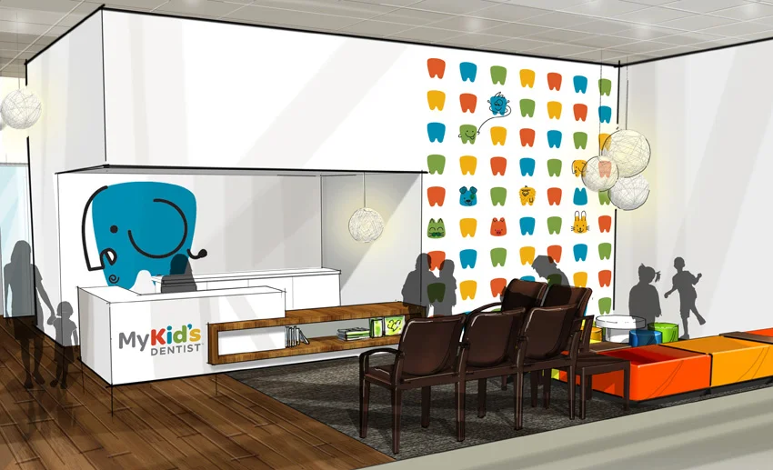 The colorful tooth wall that can be drawn on is the centerpiece of the My Kid's Dentist environmental experience. Originally proposed as an interactive touch glass wall, other manifestations are as a glass wall to be drawn on with dry erase markers, or simply as wall decals.